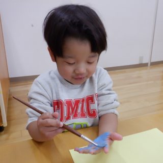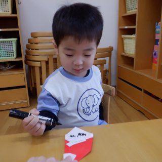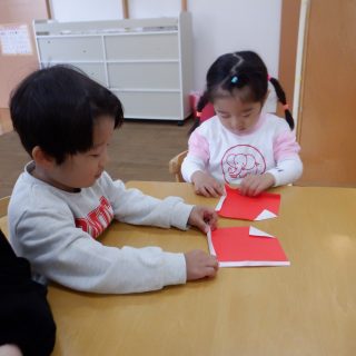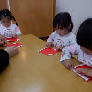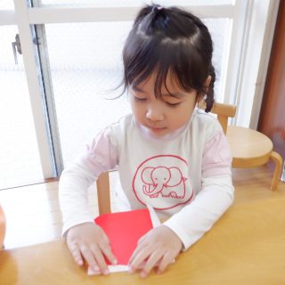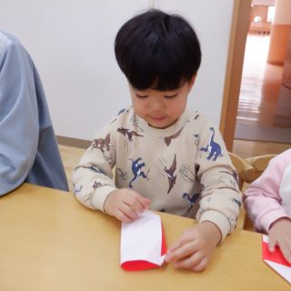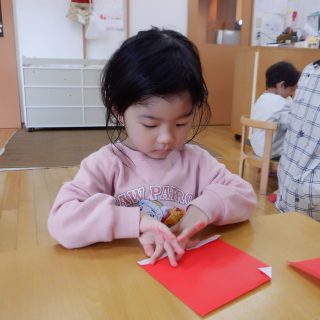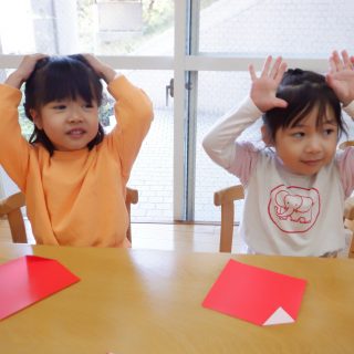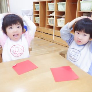折り紙に挑戦しました。手でアイロンをかけて、できたら手は頭の上に置いて✰できたよ✰のポーズ![]()