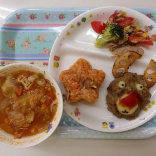 トナカイのハンバーグ チキンライス ミネストローネ サラダ