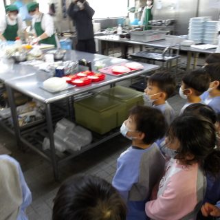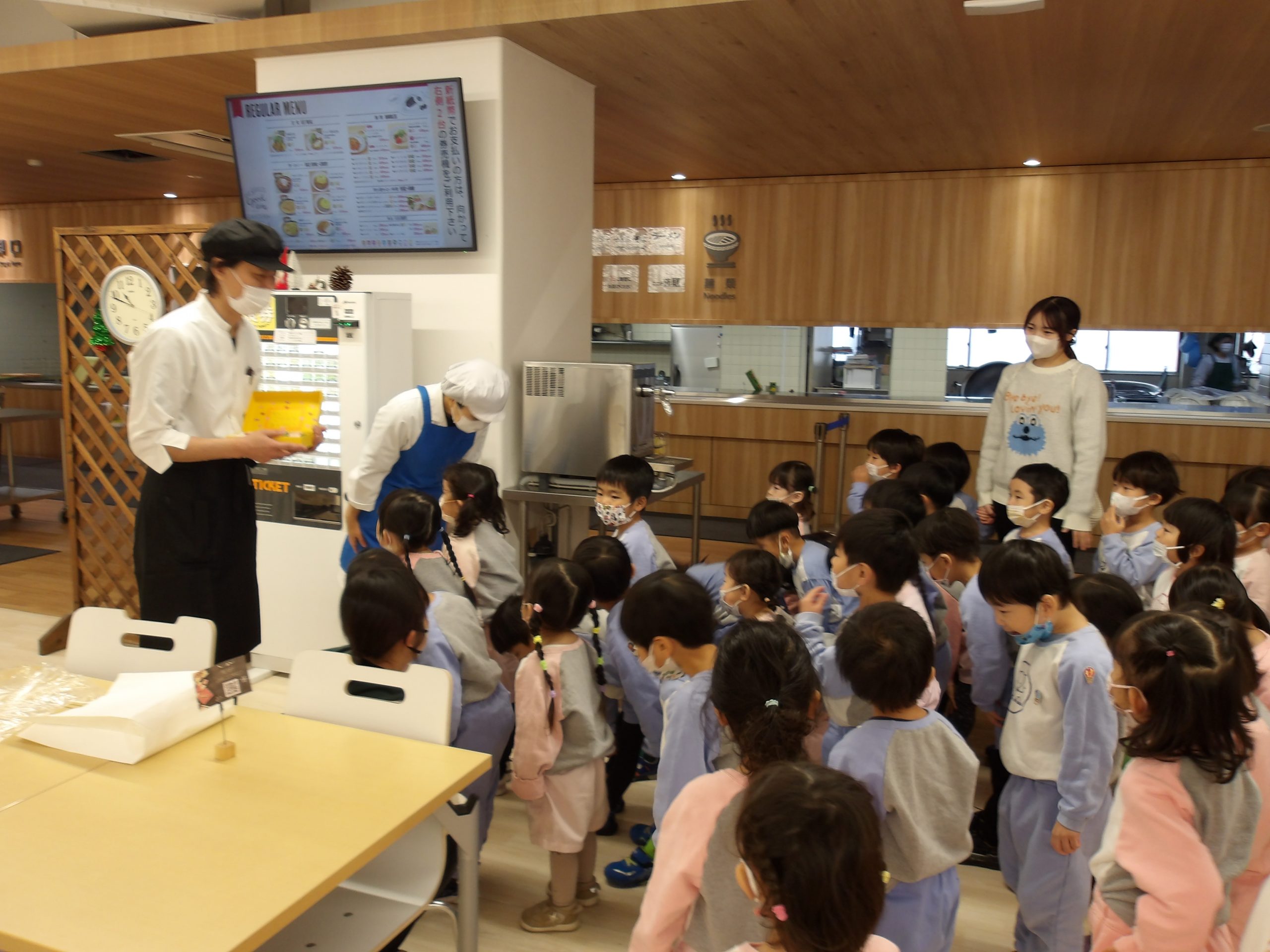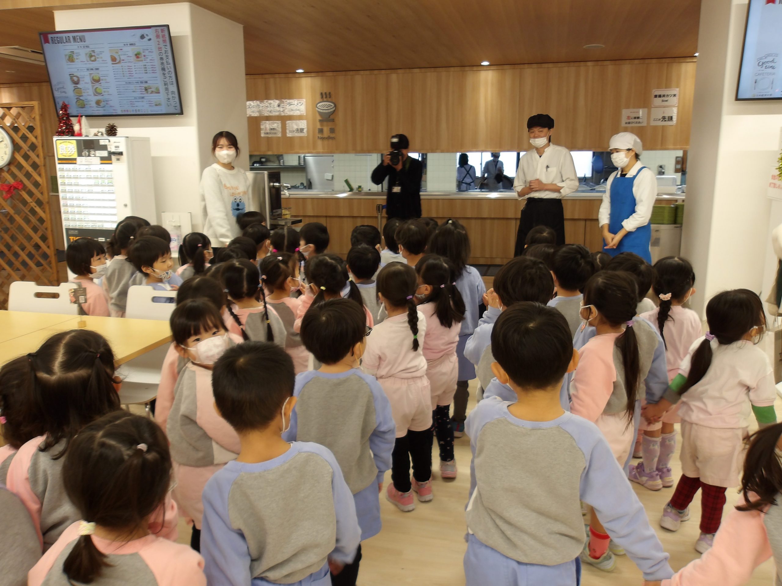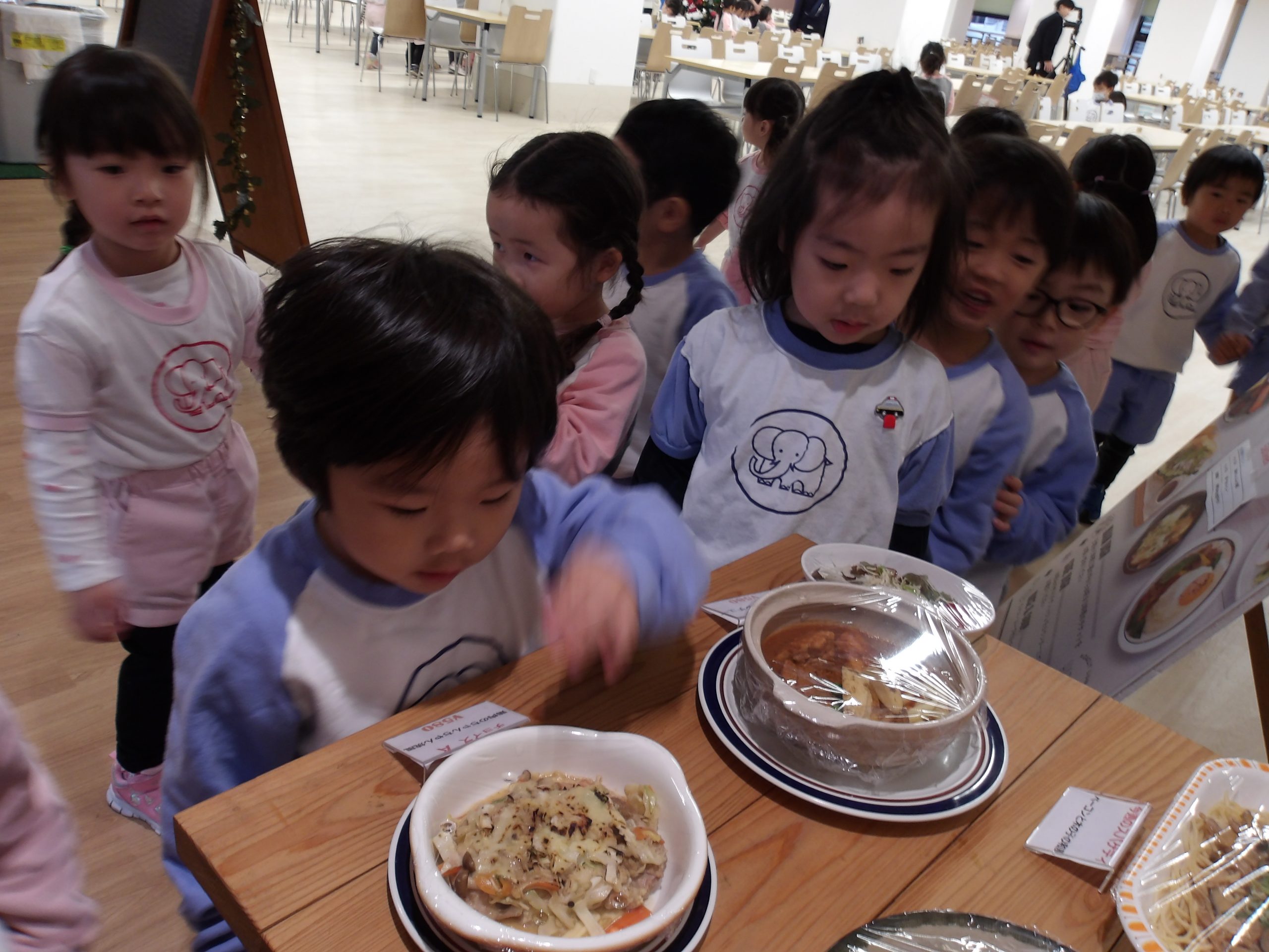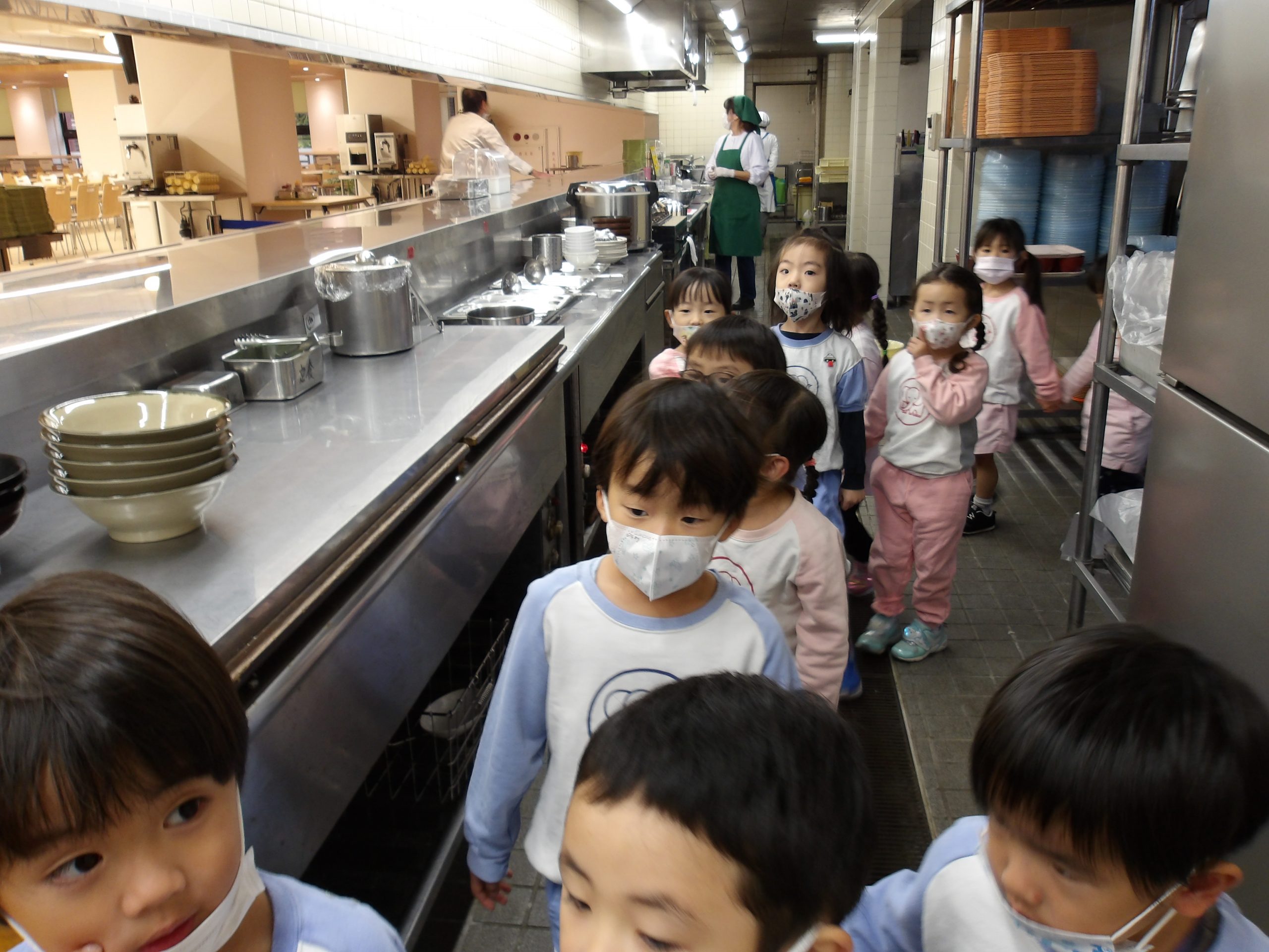 食堂では食品サンプルを見せてもらったり、厨房の中を見学したりしました。