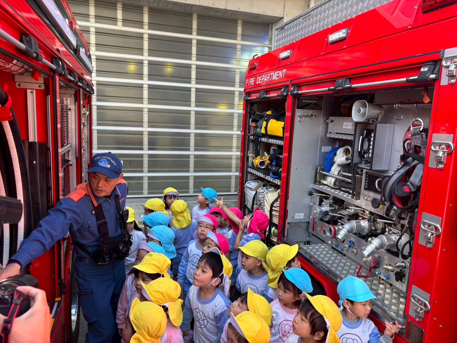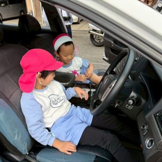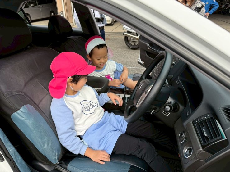 食堂などを見学し、救急車や消防車、ポンプ車などの働く車をまじかで見ることができました。