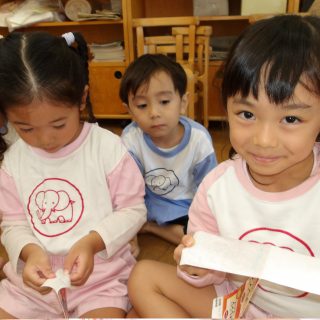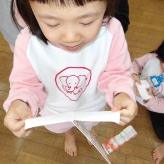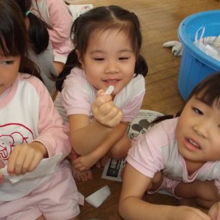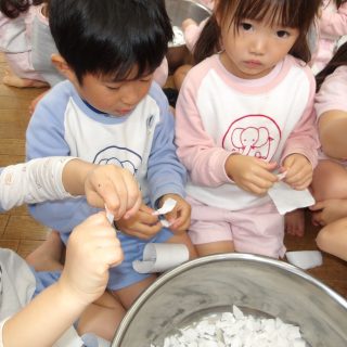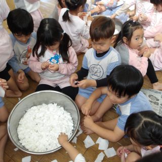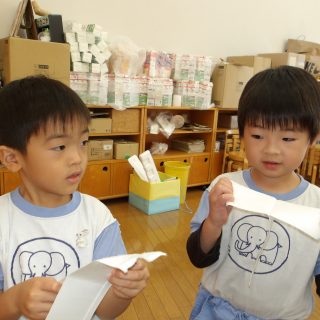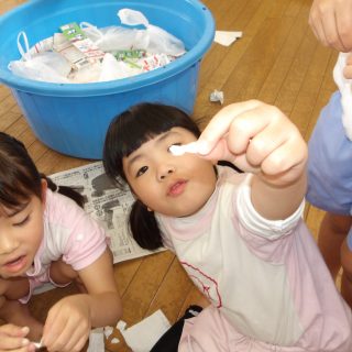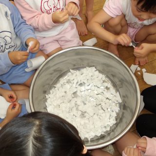 こんにちは!今回年中児はSDGsの一環として、牛乳パックを使って紙作りを行っています。